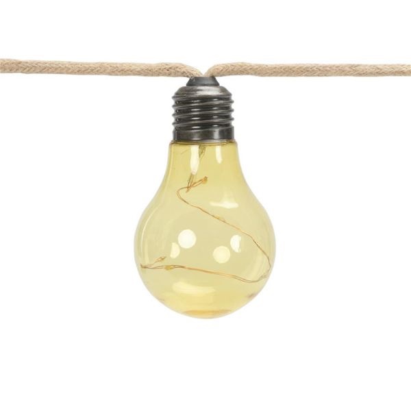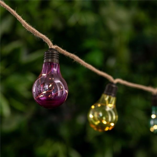 Světelná girlanda se žárovkami o délce 2m + 3m přívodní kabel, na solární baterii, určená pro venkovní použití. Tento venkovní barevný světelný řetěz má 10 integrovaných led žárovek, nemusíte k němu tedy přikupovat žádné světelné zdroje. Led žárovky ve tvaru baňky mají uvnitř umístěnou jednu světelnou LED diodu svítící teplou, nažloutlou barvou světla, která navozuje klid a pohodu. Jednotlivé baňky jsou navíc barevné – žlutá, červená, fialová, zelená a čirá – vždy po 2 kusech.