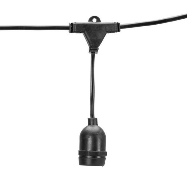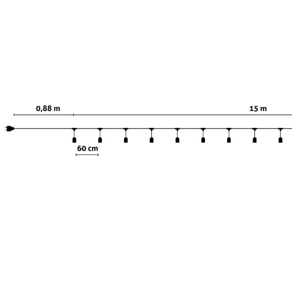 Světelná girlanda s objímkami E27 o délce 15m určená pro venkovní použití. Tento světelný řetěz má 15 samostatných objímek E27 s gumovou izolací, díky které jsou objímky chráněny před vniknutím vody. Tuto girlandu je možné vzájemně propojovat, lze tak vytvořit až 200m dlouhý světelný řetěz s maximálním příkonem 720W. Do jedné objímky lze montovat žárovku s maximálním příkonem 30W.