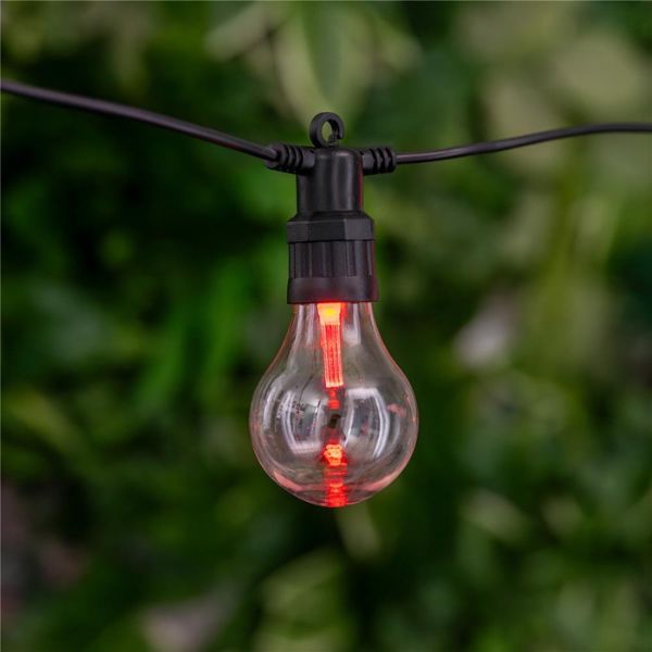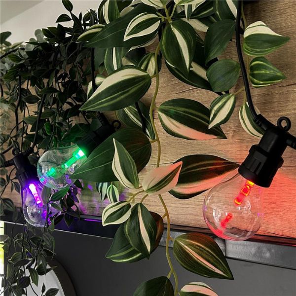 Světelná girlanda se žárovkami o délce 5m + 3m přívodní kabel, určená i pro venkovní použití. Tento venkovní světelný řetěz má 10 integrovaných led žárovek, nemusíte k němu tedy přikupovat žádné světelné zdroje. Led žárovky ve tvaru papáji mají uvnitř jednu RGB led diodu, svítící do tubusu, který odráží světlo. Tuto girlandu je možné vzájemně propojovat do celkového počtu 3 stejných řetězů, lze tak vytvořit až 15m dlouhý světelný řetěz + 3m přívodní kabel.