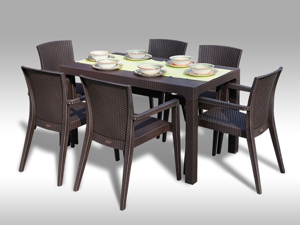 Elegantní zahradní jídelní sestava pro 6 osob sestává ze zahradního stolu Arizona a šesti stohovatelných plastových židlí Montana, vše s dezénem umělého ratanu.